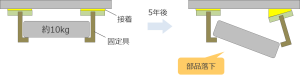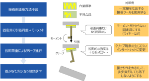 これらのツールなどを使用して検討した結果、図5のようなメカニズムで部品が落下したことがわかりました。メカニズムがわかれば、これらのどこかに対策を打つことができます。例えば、接着剤の塗布量が不足していたのであれば、一定量を吐出する接着ツールを使うことが対策になります。また、接着剤のクリープに対策を打つのであれば、機械締結式のインサートナットに変更すればよいといえます。最終的に部品が落下しないようにできれば、直接原因への対策は完了です。