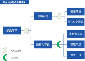 この製品は約10kgの部品を金属製の固定具で吊り下げる構造になっています。固定具は上部の部材に接着されており、固定具には常に荷重がかかっている状態です。固定具、接着部ともに十分な引張強度があることを確認し、顧客に出荷しました。しかし、5年後、固定具が接着剤のクリープでずれて掛かり代がなくなり、部品が落下してしまいました。この品質問題が発生した原因を考えてみます。原因には直接原因と根本原因があります。それぞれの原因を追究し対策を講じるのが再発防止活動です(図2)。