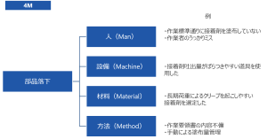 まず直接原因から考えていきましょう。直接原因は品質問題が発生した直接的なメカニズムのことです。1、2個程度の単純な要因により発生する場合もあれば、複数の要因が複雑に影響するようなものまでいろいろなパターンが考えられます。単純なものはそれほど難しくなく、原因を把握することができるはずです。複雑な要因が絡み合う場合には、抜け漏れがないように、FTA(故障の木解析)を使用したり、4Mのようなフレームワークを使用するしたりすることが効果的です。