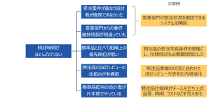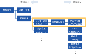 実はこの品質問題を起こした設計部門は特注品を扱っており、部品が落下した製品は特注品でした。特注品はいつ注文が入るのか予想がつきづらく、受注案件が重なると設計者の時間を確保することが難しくなります。また、営業部門から短納期で対応することを要望されることが多く、十分な設計期間を確保できないケースがあります。さらに、特注品は標準品(カタログ品)と比べて組織上の優先順位が低く、設計レビューの仕組みが未構築なままでした。さらに、設計者は標準品の設計業務の片手間で特注品の設計を行っていたことから、どうしても優先順位が低くなり、十分な検討時間を確保することができていませんでした。このような状況の中、モーメント荷重がかかるような構造の問題点が指摘されることもなく、また、クリープに対する試作品評価も不十分なまま、顧客に向けて出荷されてしまったのです。したがって、同じような品質問題を防止するためには、十分な検討時間を確保できるように対策を打たなければなりません。例えば、営業部門の受注状況を確認できるシステムを構築したり、特注品事業の状況に合わせた設計レビューの方法を社内規格化したりするなどの対策が考えられます。
