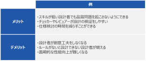 根本原因を突き止め、その対策を推進していくと、多くが設計ルールの作成に行き着きます。設計ルールには、設計基準や設計マニュアル、設計レビューの方法などが含まれます。図8に設計ルールを作成するメリット、デメリットの例を示します。