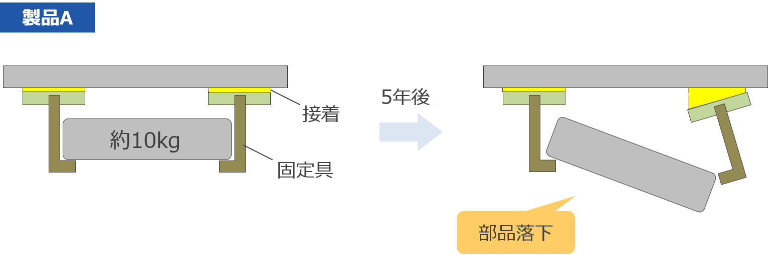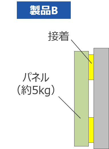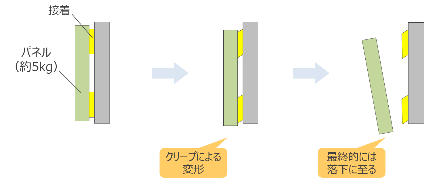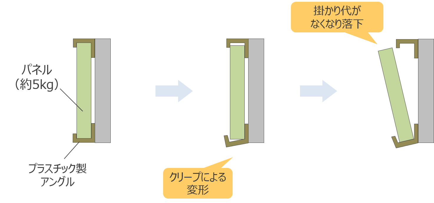 今度は接着ではなくプラスチック製のアングルで固定しています。図2の設計基準の対象として製品Bを含めていたとしても、接着ではないため設計基準の対象にはなりません。図5の仕様の場合、プラスチック製のアングルが長期に渡る荷重によりクリープ変形してしまう可能性があります。下側のアングルが変形すると、上側のアングルの掛かり代がなくなり、パネルが落下してしまうかもしれません。なぜなら、プラスチックも接着剤と同じく高分子が原料ですので、クリープしやすいからです。