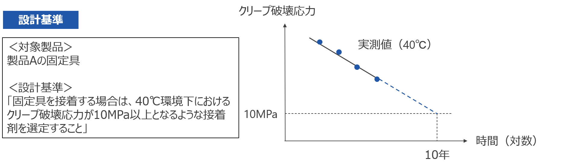 製品Aは約10kgの部品を、固定具を介して接着剤で固定していました。モーメント荷重が長期に渡って接着面に作用する構造であったためクリープ変形し、5年後に部品が落下してしまった事例です。再発防止策としては様々なことが考えられますが、例えば、図2のような設計基準を策定したとします。