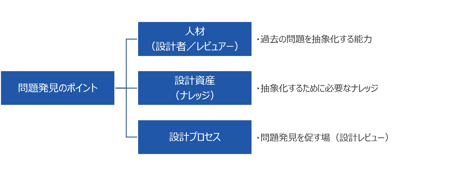 いくら抽象化する能力に優れていたとしても、対象製品に関する様々なナレッジを持っていないと、容易に本質を抽出することはできません。あるいは社内のデータベースなどで簡単にナレッジを入手できるようになっていないと、問題発見を促すことはできません。過去トラブルなど様々な設計資産を日々蓄積し、効率的に検索できる仕組みを作ることが重要です。