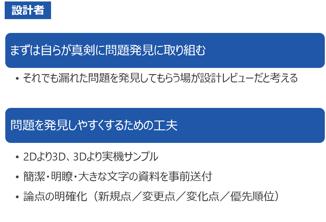 設計者はまず自らが真剣に問題発見に取組む必要があります。適当に設計しておいて問題を発見してもらおうという態度では、イージーミスの発見にばかり労力が費やされ、本当に重要な問題の発見につながりにくくなります。真剣に問題発見に取組み、それでも漏れた問題を発見する場がデザインレビューだと考えた方がよいでしょう。また、資料を事前送付するなど、問題を発見しやすくする工夫も重要です。問題を発見してほしくない設計者が、これと全く逆のことをしているケースを見たことがありますが・・・。
