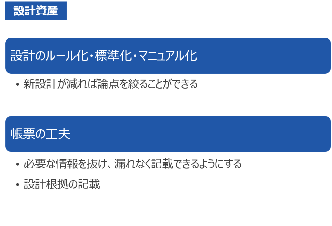 再発防止活動を通して設計のルール化や標準化などが行われるはずです。そのような努力を続けていると、ルール通りに設計するものと、新設計するものにわかれていきます。設計の内容によっては、手間をかけて新しく設計してもあまりメリットがないようなものがあるはずです。できるだけ新設計を減らすことよって、議論するポイントが絞られ、問題を発見できる確率が向上します。また、デザインレビューで使用する帳票を工夫することにより、問題発見に必要な情報を抜け、漏れなく記載できるようになります。さらに帳票に設計根拠を記載すれば、なぜそのような設計をしているのかが明確になり、問題発見がしやすくなります。