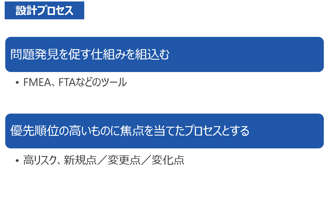 デザインレビューとは、設計内容に関して、社内の有識者が集まり、設計者が気づかないエラーや問題を発見する場だと考えればよいでしょう。つまり、デザインレビューを設計プロセスの中に組込むことによって、忙しくても、余裕がなくても、しっかり問題発見を行うことができるのです。また、デザインレビューでは設計者がレビュアーに対して設計内容を説明しないといけないため、文書作成が不可欠です。文書作成は設計者にとって大変な負荷がかかりますが、それが設計根拠などの設計資産として蓄積されることになります。次項で解説するFMEAやFTAはデザインレビューで使用されるツールの一つです。