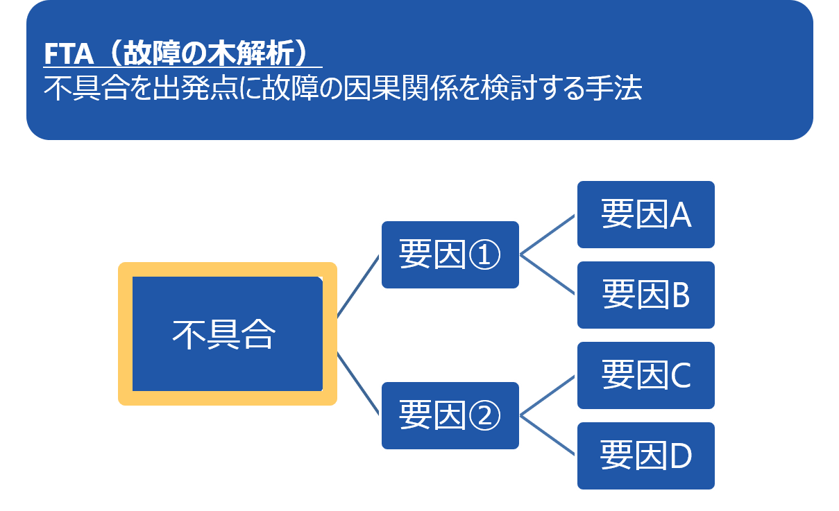 FTAはFMEAとは反対で、不具合から出発します。その不具合が生じるのはどのようなときか?を考えていくツールです。起きてはいけない重大な不具合を検証する場合や、数多くの部品や条件が複雑に絡み合う場合の問題発見のツールとしては、FMEAよりも優れています。ただし、大変な手間がかかるため、すべての不具合について、FTAを実施することは現実的ではありません。FMEAの補完的ツールと考えておきましょう。