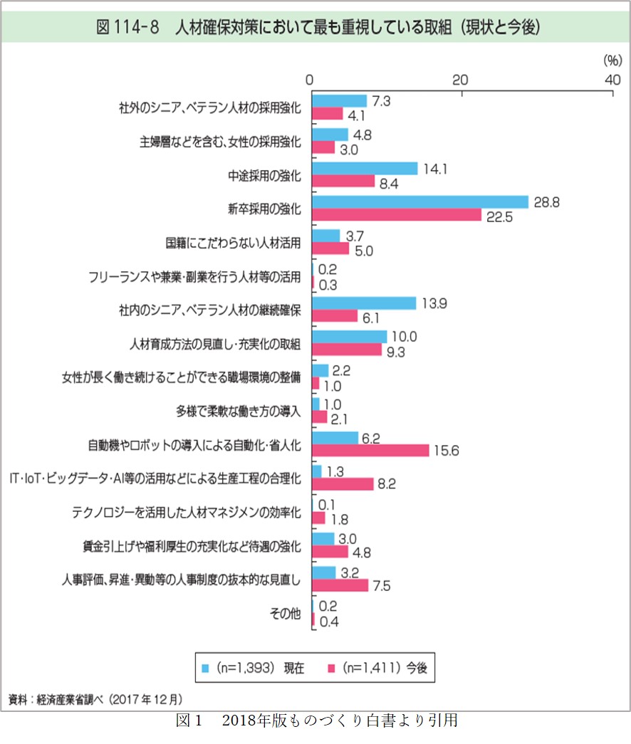 図1に2018年版ものづくり白書から人材確保対策において最も重視している取組(現状と今後)を引用します。