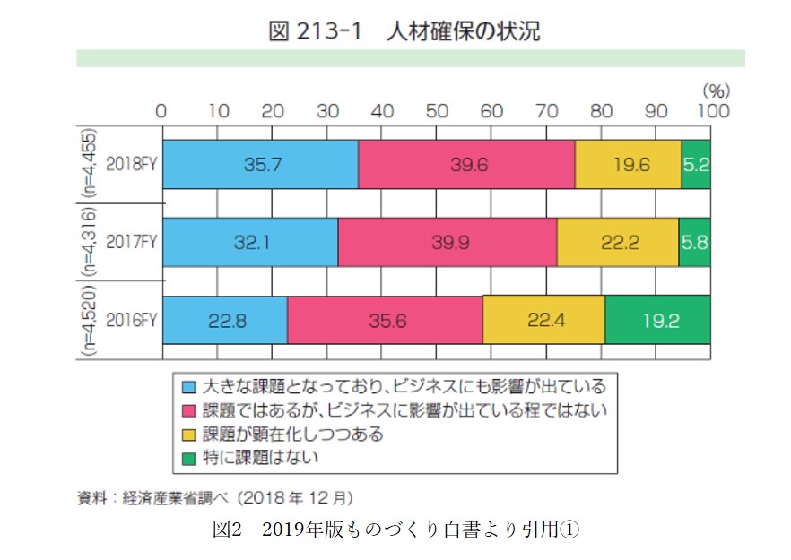 図2、3に2019年版ものづくり白書から人材確保の状況と就業者数の推移を引用します。