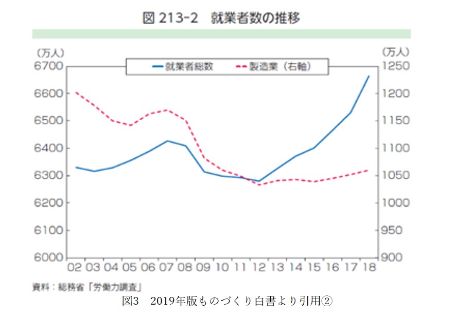 この状況は図3、就業者数を見ても明らかです。2012年を境に就業者総数は右肩上がりです(青実線)が、一方で製造業における就業者数は2012年以降横ばいです(赤点線)。