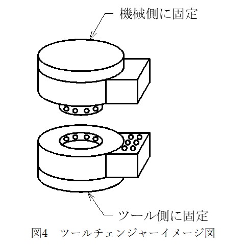 ツールチェンジャーという機械要素があります。図4に示すようにオス側とメス側に部品が分かれていて、空気圧で締結・分離する要素です。締結・分離時にはエア配管や電気信号用配線の接続・分離も可能です。