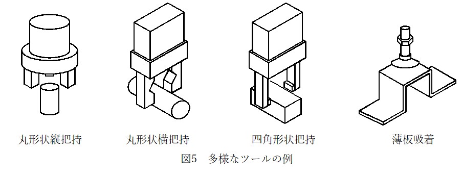 図5に示すようにワークの形状に合わせたツールを製作し、必要に応じてツールチェンジャーを介して交換させれば様々な形状のワークを1台の自動機やロボットで扱うことが可能です。