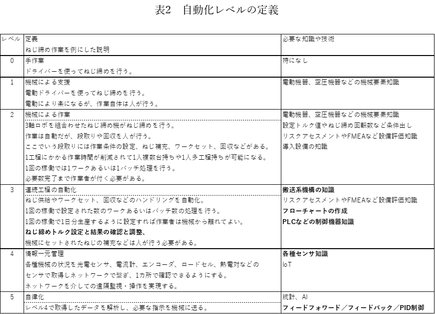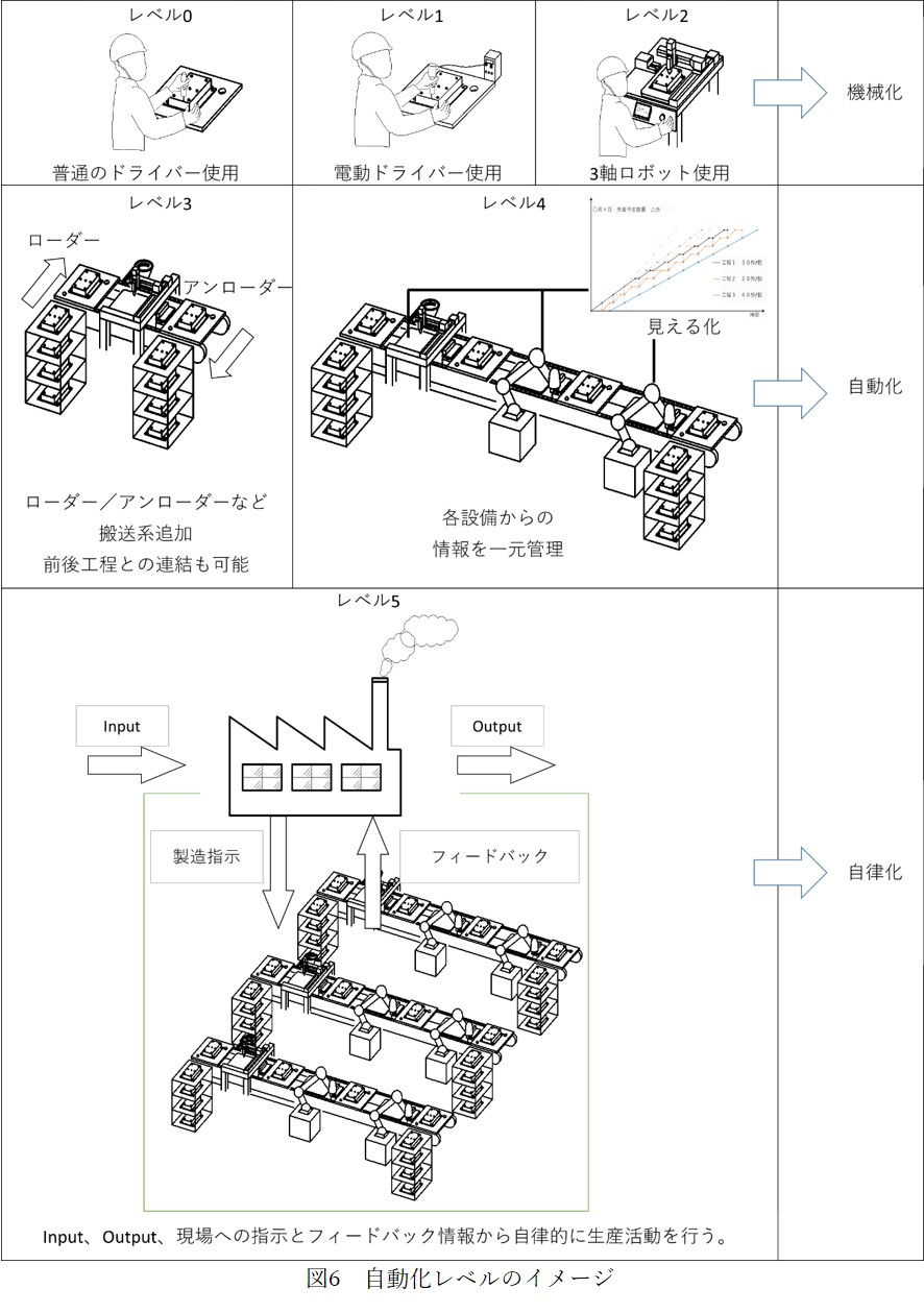 自動化レベルの例を表2に各レベルのイメージを図6に示します。IoTやAIを利用するのはレベル4,5、ロボットの出番もおおよそレベル3(一部レベル2)からです。
