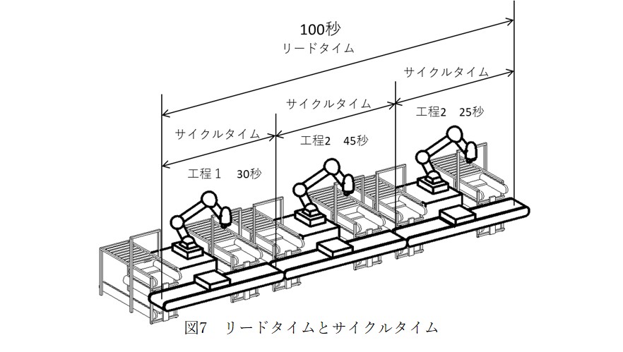 納期のことですが、設備導入に当たっての評価という意味ではリードタイムとサイクルタイムになります。図8に示すように一つのラインに複数の工程があるとき、リードタイムとは製品一個がラインに投入されてから完成するまでの時間のことです。サイクルタイムとは複数の工程それぞれが作業を開始してから完了するまでの時間のことです。図7の例では工程2が最も遅い45秒となっています。最も遅い工程をボトルネックと呼びます。