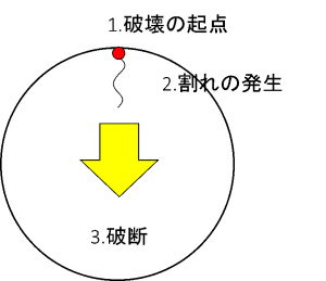亀裂のある材料の評価として応力拡大係数と破壊靭性がある。応力拡大係数とは亀裂付近の応力状態を表し、破壊靭性とは亀裂が進行する最小の応力を表す。亀裂先端はとても鋭く応力集中を起こしているが、亀裂を進行するためには一定の応力が必要になる。それが破壊靭性である。破壊靭性が高い材料は亀裂が進行しにくく、破壊靭性が低い材料は亀裂が進行しやすい。