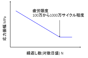 そして多くの鋼では一定値以下の応力振幅になると、どれだけ応力振幅を繰返しても疲労破壊を起こさないことが起こる。この応力を疲労限度と呼び、設計上重要な値となる。疲労限度はおおよそ100万から1000万回の応力振幅頃に表れることが多い。