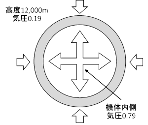 飛行機は上空高く飛行するので、地面とは気圧が異なりおよそ0.2気圧程度になる。しかし飛行機の内側は人がいるので外側よりも圧力は高めにしている。そのため、飛行機はフライトの度に機体内側から外側に向けて応力が負荷されている。フライト時に機体に負荷される応力の模式図を図3に示す。