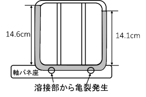 この時に新幹線の台車と呼ばれる部品に割れが発生した。直接の原因としては台車と軸ばね座と呼ばれる部品を溶接する時に寸法精度が悪く修正するために板厚を削りすぎてしまい強度低下して割れが発生したのである。台車の割れの様子を図4に示す。