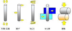 材料の負荷される応力はその向きや位置などから大きく5種類に分けられる。これを図5に示す。1引張圧縮、2曲げ、3ねじり、4せん断、5接触である。このような応力の違いは疲労試験の種類にも反映されている。疲労試験でも引張圧縮疲労試験、回転曲げ疲労試験など応力の種類によって分けられている。