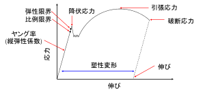 材料に引張応力を負荷すると最初は直線的に応力とひずみが上昇する。この時材料に負荷した応力を取り除くと元の形状に戻る性質がある。これを弾性変形と呼ぶ。そしてこの時の応力とひずみの関係からヤング率(縦弾性係数)が求められる。