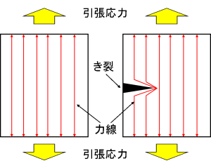 亀裂のない材料と亀裂のある材料では当然き裂のある材料の方が弱い。そして、どの程度の亀裂によって材料の強度が低下するのか、など亀裂のある材料の評価は破壊力学などで議論される。