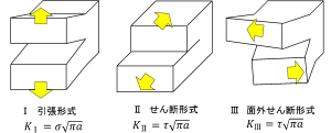 また亀裂に負荷される応力の向きによって応力拡大係数は主に3つの形式に分けられる。1引張形式、2せん断形式、3面外せん断形式である。材料に負荷される応力は5種類だったが、亀裂については3種類となる。亀裂の負荷モードとそれぞれの応力拡大係数を図8に示す。
