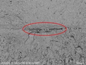 また、不純物介在物ではないが溶接欠陥やダイカストの引け巣なども材料中の欠陥となる。これらは材料の中でボイドや空孔となる。不純物介在物と異なり物質として存在しないため、EDSによる破面観察では跡が残らない。しかし、ボイドや空孔もサイズや分布が多くなるほど疲労破壊の起点になりやすくなる。ボイドや空孔は材料内部の欠陥ではあるが、その多くは断面組織観察などで観察できる。また製品の品質検査として超音波検査などの非破壊検査で評価することもある。