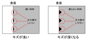 疲労破壊におよぼす影響として硬さと残留応力がある。硬さとは表面に異物がぶつかった時の変形抵抗と表すことができる。一般的な傾向として硬い材料は引張応力なども強い。そして硬い材料ほど疲労にも強くなりやすい。硬い材料は表面欠陥や応力集中が起こりにくいからである。反対に軟らかい材料はキズがつきやすい。そのため軟らかい材料は応力集中が起こりやすい。この模式図を図2に示す。