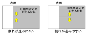 反対に引張残留応力とは材料にき裂が入った時にき裂を広げるように材料自身が作用する。これはき裂進展を促進するので、疲労破壊が大きく進行する。そのため引張残留応力は疲労破壊を起こしやすくする危険な残留応力となる。疲労破壊に限らず、引張残留応力は材料にとって有害な残留応力として扱われる。圧縮残留応力と引張残留応力について図3に示す。