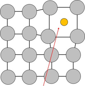 侵入型固溶体とはもともとの結晶構造のすき間に入り込むことである。これはある程度小さい元素でないとできないので、主に炭素や窒素などを添加した時にあてはまる。そして置換型固溶体と侵入型固溶体では侵入型固溶体の方が材料が強化されやすい。侵入型固溶体の模式図を図4に示す。