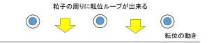 転位が金属材料中を移動している時に硬い粒子に接触すると、転位は簡単に硬い粒子を通ることができない。そして、転位は粒子の周りに張出すような状態になる。ここからさらに転位が無理やり粒子を通り抜けようとすると、粒子の周りに転位ループとよばれるものを残して転位は粒子を通り抜ける。この転位ループはオロワンの機構やオロワン応力と呼ばれている。この模式図を図6に示す。これによって粒子分散強化が効果を発揮する。そして粒子分散強化は粒子の間隔が狭いほど大きくなる。粒子分散強化は時効析出硬化などでよく行われている。