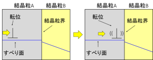 これは転位の動きにも関係してくる。転位は結晶粒が多くても、それを通過して最終的には材料表面まで移動する。しかし、結晶粒界に到達して、となりの結晶粒に移動する時はすべり面の向きが異なるので、結晶粒界を通過するためには大きな力が必要になる。そのため転位にとって結晶粒界そのものが障害物となる。結晶粒界が多いことは結晶粒が細かいことと同じである。そのため結晶粒を細かくすること(結晶粒界を多くすること)で材料強化が行われる。