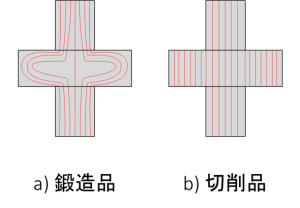 クランクシャフトのような複雑な形状の製品は応力集中を起こしやすい場所が生じやすい。これをもし切削加工で成形すると応力集中している場所が弱く疲労破壊の起点になりやすいが、鍛造加工された製品では形状的に応力集中しやすい場所でも、鍛流線の影響によって切削加工品よりも疲労破壊の起点が起こりにくくなる。これが鍛造品が強い理由である。