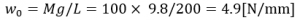 まずは等分布荷重を求めます。ワーク質量が100kgのため、重力加速度g=9.8として、軸には100×g=100×9.8=980[N]の力がかかっています。これが軸の長さL=200にわたり作用するため等分布荷重は次の通りになります。