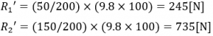 次の条件の下で軸受に生じる反力R1、R2を求めてください。