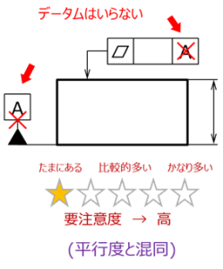 平行度は平面度を含んだ概念であるため、平行度を緩めると平面度も自動的に緩くなる。つまり、平行度だけで厳しい平面度も要求すると、設計仕様としては過度な平行度を設定することになる。