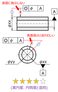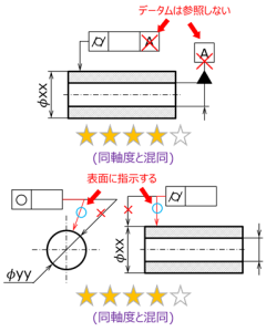 逆に2-2項で述べたように、真円度や円筒度の指示先を寸法線に揃える、という間違いもあるため、同軸度/同心度と真円度/円筒度の区別には十分注意が必要である。