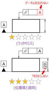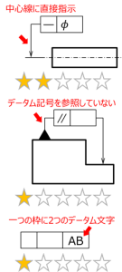 データム記号の配置の位置が少し異なるだけで、形体のどの部分をデータムとして指示しているかの意味が異なるため、注意が必要である。