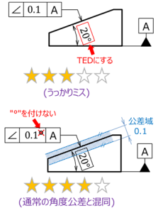 傾斜度で比較的多い間違いは、公差値に角度記号を入れるケースである。
