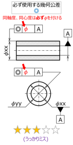 これらの間違いは、真円度や円筒度を同軸度、同心度と混同している場合に多い。