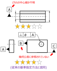 図11上は、中心線に対して直接データムを指定した例であるが、この図例のように中心線を共有する複数の円筒形体がある場合に、どちらの中心線を基準とするのかがあいまいである。