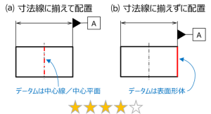 同図⒜のように、寸法線に揃えて配置した場合のデータムは中心線や中心平面である。
