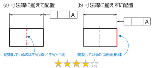 同図⒝のように寸法線に揃えていない場合は、データムは表面形体(この図例では右側面)となる。