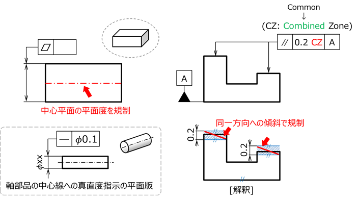 同図左下は平面度と同じく形状偏差を規制する真直度を、中心線に対して指示した例であるが、中心平面に対する平面度指示は、この真直度指示例の平面版と考えられる。