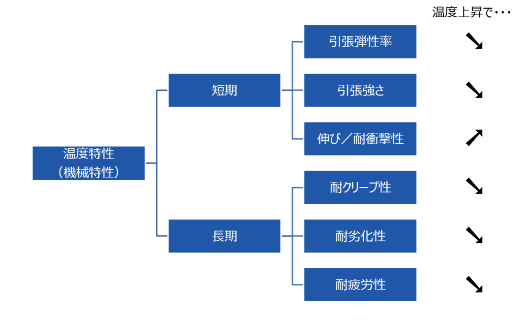 プラスチックは金属材料のように高温にしなくても、少し加熱するだけで流動するようになるため、複雑な形状でも容易に成形することができます。これはプラスチックが工業材料として多くの製品に採用されている大きな理由の一つです。一方、それほど高い温度にしなくても流動するようになるということは、使用環境温度が少し変化しただけで、材料特性に大きな影響を与えることになります。機械特性を例に考えてみましょう(図1)。