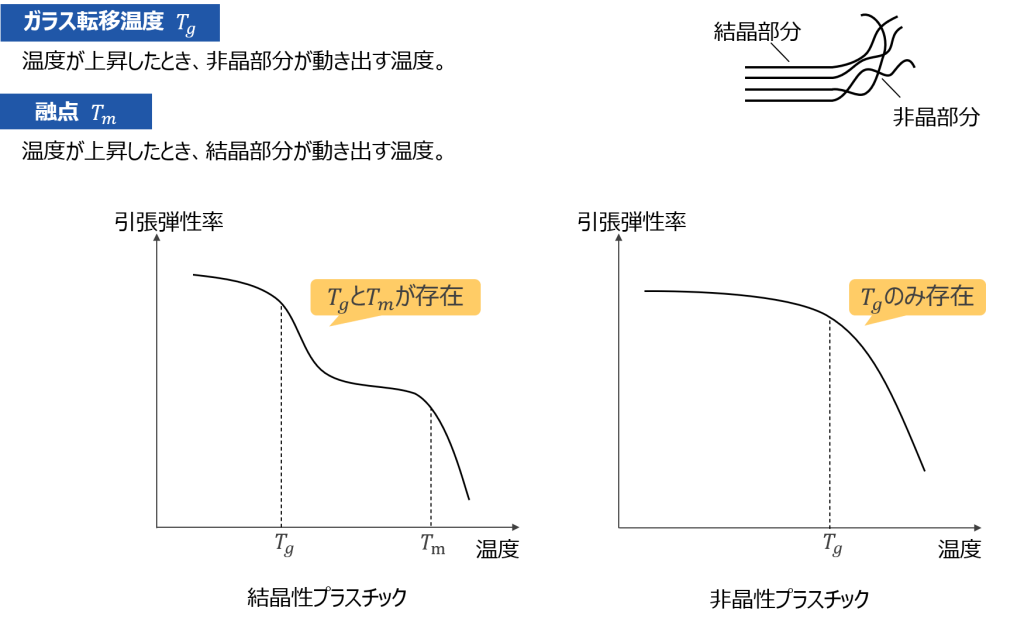 非晶性プラスチックは結晶構造がないため明確な融点は存在せず、ガラス転移温度だけを持ちます。ガラス転移温度付近で引張弾性率の低下が顕著になり、実用に耐えられなくなります。ガラス転移温度は使用上限温度を示す値ではありませんが、高いほど耐熱性が高い材料だといえます。