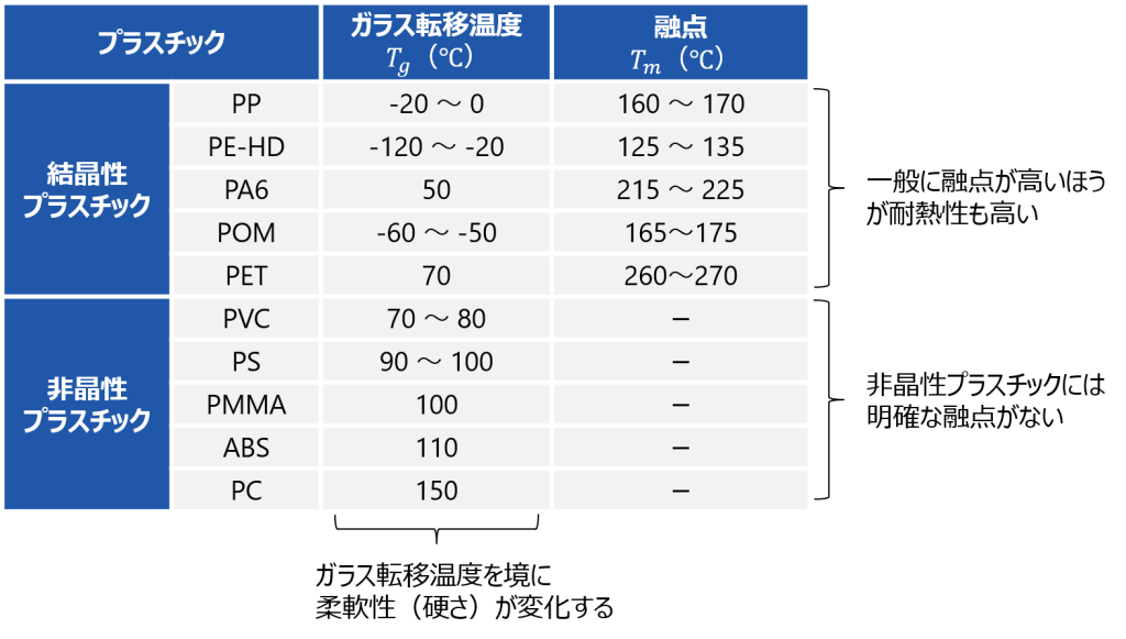 プラスチックは温度が変化すると、引張弾性率や破断時の伸びなど様々な材料特性が変化します。材料特性は温度に比例して変化するのではなく、特定の温度付近で急激に変化します。プラスチックを低温の状態から温度を上げていく場合を考えてみます。温度が低い状態では、プラスチック中の結晶部分も非晶部分も自由に動くことができず、柔軟性が低い状態(ガラス状態)です。温度を上げていくとある温度付近で非晶部分が動き出すようになります。このときの温度をガラス転移温度といいます。非晶性プラスチックは分子構造に結晶部分がないため、ガラス転移温度を超えると、急激に軟らかくなります。一方、ガラス転移温度を超えても、結晶部分はまだ動かないため、結晶性プラスチックは硬さを維持しています。さらに温度が上昇し、結晶部分も自由に動くようになる温度を融点といいます。融点を超えると結晶性プラスチックも急激に軟らかくなります。