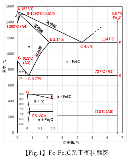 「鉄-炭素系の平衡状態図」として、「鉄-セメンタイト系の平衡状態図」が通常用いられる【Fig.1】。