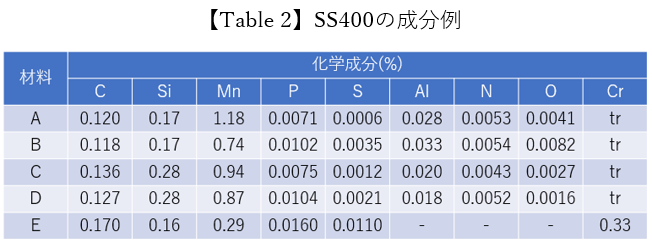 実際に、SS400鋼材の成分は【Table 2】のように製造者によるばらつきがあり、